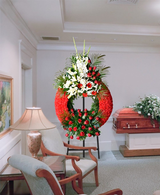Las Coronas Funerarias son una forma de mostrar condolencias a la familia y al difunto, en Floristería Tanatorio Tarragona sabemos la importancia de este momento y podemos ofrecerle un amplio catálogo de Coronas Funerarias, como la siguiente Corona Clavel Rojo Especial, es una de nuestras Coronas Fúnebres más elegantes destaca por su cabezal inferior de rosas y uno superior variado, además nuestras flores para funeral son siempre de la mejor calidad gracias a nuestros proveedores nacionales e internacionales.